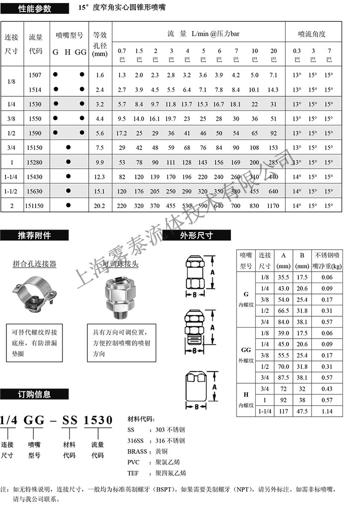窄角噴嘴的特點是能產生實心錐形噴霧形狀,噴射區域成 圓形,窄角噴射角為30度。噴嘴產生分布均勻,顆粒較粗的噴霧, 15度噴嘴更是如此,單位面積上的衡動力顯著高于同樣流率下的 較寬角噴嘴,窄角噴嘴都具有可拆卸的帽蓋與葉片。 1/8英寸-1/4英寸尺寸的噴嘴是用棒材制成的,11/4英寸 及更大尺寸的噴嘴是鑄造而成的。窄角噴嘴是粗細工藝制造的, 實現了精確的規格要求,以保證其性能。其均勻噴霧分布來 源于新穎的葉片設計、大的流動通道以及優良的噴流控 制特性。